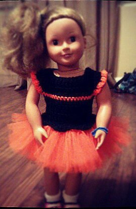 An adorable design for your 18 inch doll. The bodice is crocheted with optional trim coloring to match the tulle skirt. 2 button closures on the back.