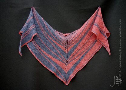 Aggregate is an arrowhead shaped wrap/scarf. It is made using 2 colour skeins of DK/Worsted weight yarn. It is knitted from the top-down with short row wedges and arrows that form a distinctive Left side/Right side mirror effect.