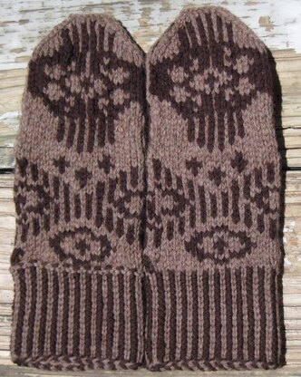 These wool hands couldn’t be easier or faster to finish—two colors, simple chart, large needles, worsted weight yarn, a three-needle bind-off for the mitten body, and k2tog closure for the afterthought thumb.