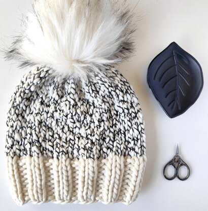 With two skeins (Rasta and Caracol) you can knit a hat and a matching cowl. This hat is a super easy project that can be done in less than two hours.