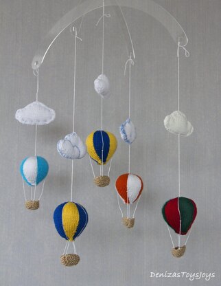 Air Balloons with clouds Baby Mobile. The finished baloon with basket is approximately 6,3 inches (16 cm) tall. The finished baloon with basket and cloud is approximately 12 inches (30 cm) tall.