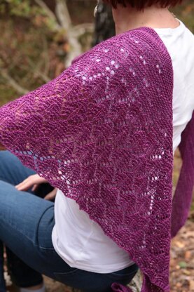 “Ajourette" is an asymmetrical, triangular shawl knit from side to side on the bias in one piece. It begins with a garter stitch on one end and finishes with a wide lace section.
