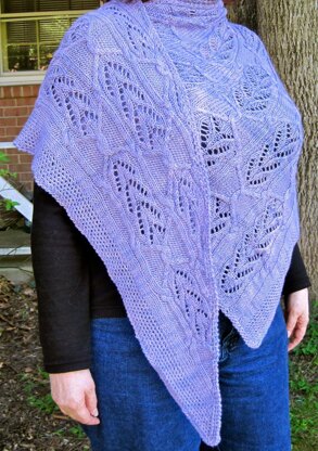 This lace shawl is triangular in shape, and features a unique and very ornate cable lace panel on one side, which is combined with a very unusual mesh stitch. The shawl can be worn in many different ways. This shawl will keep you warm on cool spring nights, and you’ll have a lot of fun making it, if you enjoy cabling. The FO is well worth having, as it will be a fun piece to have in your wardrobe, and will attract many “oohs and ahh’s.