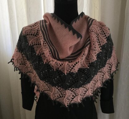 This is lovely, flowing, feminine shawl. Made of Knit Picks "Palette", you have many color choices, although you can use any fingering weight yarn. You will need about 700 yds of the main color (in this case, it's the pink) and about 450 yds of the contrasting color (in this shawl, it's the grey). You will use 680 size 6/0 glass beads, Miyuki #451 (same color as cc and 340 size 6/0 glass beads, Miyuki #518 (same color as mc). You'll need a size US 13/14 steel crochet hook or the smallest size of Fleegle Beader to attach the beads.