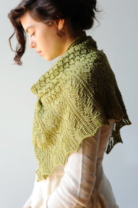 A traditional triangle shawl featuring a flowing series of lace patterns. Inspired by the undulating forms of seaweed and the summer chills that result from overly air-conditioned offices.