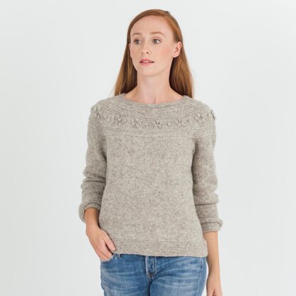 This round yoked pullover is worked from the top down, in once piece, and captures the essence of wild roses. The sweetness created with the bobbles is toned down with the use of a beautiful rustic yarn. Make a size with positive ease, or make it more fitted. The instructions include optional waist shaping if you prefer a more fitted shape.