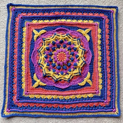 This square is designed to be a central focus for an afghan / blanket surrounded by other squares which meet the standard 12 inch worsted weight definitions. As such the final stitch count is 79 stitches per side (= 39 sts x 2 squares, + 1 st for the join). US terminology