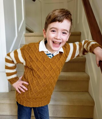 Aldwyn is a classic cabled v-neck pullover for kids with easy, modified drop shoulder shaping to ensure that there’s plenty of room to move and play! Choose a size with approx 2-3” of positive ease in the chest. The size 6-8 yrs is shown with approx 2” of positive ease. The body is knit in the round from the bottom up to the armholes. The front and back are each knit flat and then seamed at the shoulders. Stitches are picked up around each armhole to work the sleeves in the round down to the cuff.