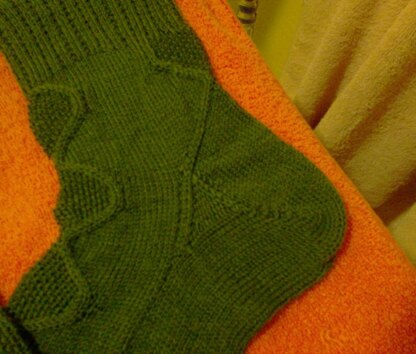 Design features include: -Toe-up construction -Short-row heel and mini-gusset/heel flap for large insteps -Simple cables (two twists per round) -Charted cable motif -Intuitive, flowing design -Unisex You should have experience: -Knitting toe-up socks -Reading charts