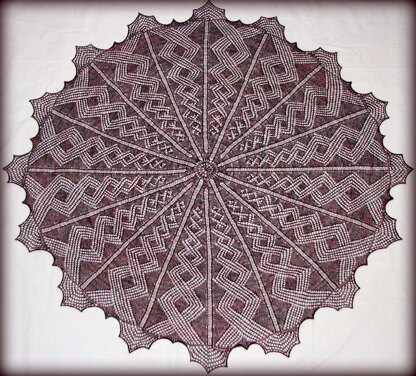 The shawl is begun with written instructions for a stockinette stitch beginning, after which the lace portion begins. The lace pattern is charted only and it consists of three different charts. The stitches used are k, p, yo, k2tog, k3tog, skp, sk2p and m1. The swatch uses also p2tog.