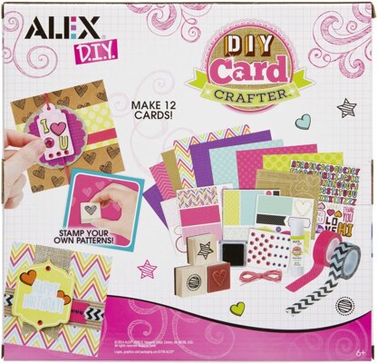 Alex Toys-DIY Card Crafter Kit. Make up to twelve cards for friends and family! Perfect for hours of fun. This 12x12x2 inch package contains twelve printed cards, twelve assorted envelopes, 101 stickers, forty-seven precut shapes, thirty sticky gems, forty adhesive foam squares, one 60 inch long twine, three wooden stamps, one stamp pad, two washi tape rolls 5.5 yards each, one 0.29oz glue stick and easy instructions. Recommended for ages 6 and up. WARNING: Choking Hazard-small parts. Not for children under 3 years. Conforms to ASTM D 4236. Imported.