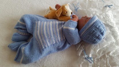 A lovely knit for the new arrival and suitable for both baby boys and baby girls by changing the colour of yarns used.