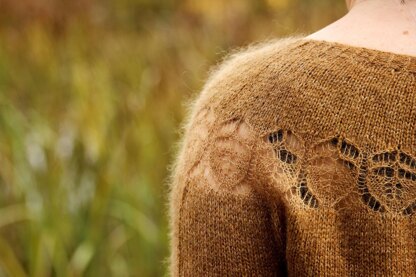 Alho is a seamless sweater worked top-down. The sweater has a round yoke with a delicate lace pattern and long sleeves with the lace repeated on one cuff. The sweater has plenty of positive ease and an A-line shape increasing towards cropped hem. The neck is shaped higher and the back hem longer using short row technique. Alho gets its beautiful texture from the combination of cashmere and mohair/silk strands held together, while the lace is worked with only mohair/silk.