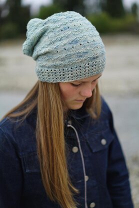 Full of texture and lace this is a fabulous slouchy hat. Lacey rib with rows of eyelets and diamonds, topped off with a pompom. Knitted in 4ply/fingering yarn on 3.25mm (3 US) needles The Hat pattern has two versions, knitted flat on straight needles or on the round on double pointed needles.