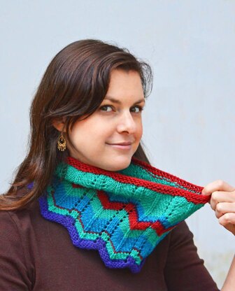 Beautiful waves of stripes make this cowl a pleasure to knit and a dream to wear. It is designed with an uncomplicated lace pattern, separated into logical sections by stitch markers for ease of keeping track and memorizing the pattern.
