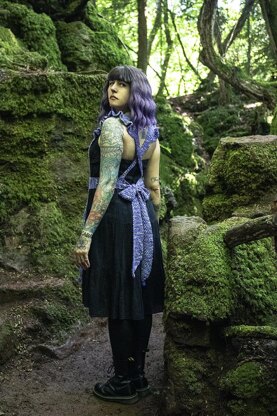 Alice is knit seamlessly from the bottom of the apron up, with afterthought pockets and straps that criss cross in the back. Stitches are then picked up for the ruffles at the shoulders and along hem. The sash is knit at the end, which has angled edges, and is then seamed to the yoke of the apron, as well as the straps. The four sizes accomodate XS-6X busts (32-64 inches), and the sash can be made longer or shorter to suit any waist measurement.