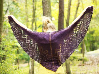 Purple shawl used 2 skeins BC Garn Silkbloom Extra Fino [55% Merino, 45% Silk, 328yd/300m per 50g] on 3.5 mm (US 4) needles. Blocked size is 127 x 64 x 122 cm (50 x 25 x 48 inches). Gauge: 20 stitches = 10 cm in stockinette.