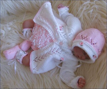 Such a lovely outfit to knit for the new arrival and what a special set to welcome home a new baby girl and for those precious first photographs.
