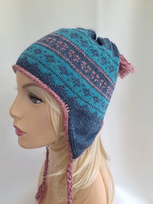 Upbeat twist to a traditional ethnic inspired hat. Ear flap style beanie for toddlers, children and adult/teens. Tassel and braided pigtail embellishments added. Easily completed in a few evenings.