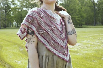 All Things Spring is a uniquely shaped shawl inspired by all the things we love about spring! The shawl features stockinette and garter sections broken up by stripes and eyelet rows. The edging is worked in a pretty little picot bind off. After knitting the shawl little daisies are embroidered onto the solid stockinette sections. Knit up in Fiber Story merino/ silk yarn, it has a lovely drape and beautifully soft hand. All Things Spring is feminine, romantic, and is a celebration of that special time of year when new life begins to sprout from the earth!