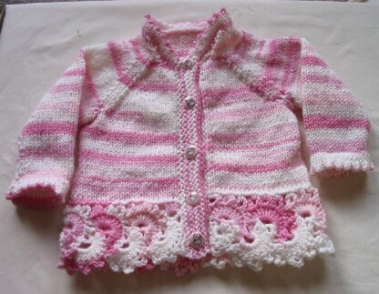 Sleeves Knitted first ,then joined in at the armhole. Crochet border; picot cuffs & collar.100 (150)gms yarn.