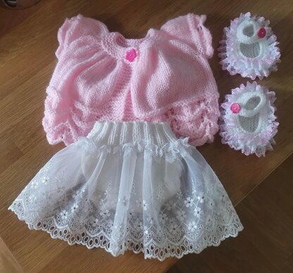 Knitting pattern comprising of the sweetest little set. The cardigan has a lovely lacey pattern, pants can be done with or without voile attached and the cutest shoes. Sizes approx birth - 2 years, 16" to 22". Knitted on straight needles.