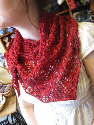 At virtually any time of year, a small scarf-sized shawl can be a lifesaver. Shawls can dress up an outfit, brighten a dull day with a flash of colour, and provide an extra bit of warmth under the collar during chilly, transitional seasons. This one uses just a single 100g skein of fingering weight yarn, and the colour possibilities are endless! Adventurous knitters new to lace will find this approachable, and experienced knitters will have a finished object in no time. Choose your favourite single skein and ‘Let’s go!’
