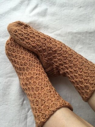 履き口から編むトップダウン式の靴下です。 かかとはフレンチヒール、つま先はみっつに分けて減目をするタイプです。