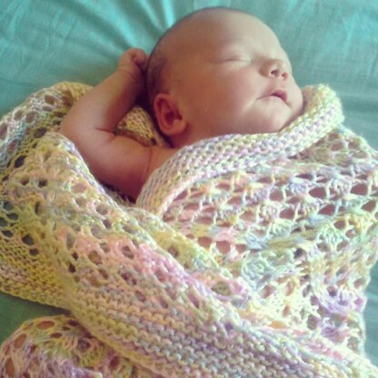 Alouette is a square blanket sized for baby and features easy knitted lace with a garter stitch blanket border. This design is worked in the round from the center out in lace wedges divided by four spines. The yarn presented here is a very soft and silky worsted weight acrylic perfect for baby’s comfort and easy to wash. Alouette is fun and relaxing to knit and makes the perfect soft layer for snuggling with baby, covering your infant seat, or wrapping baby up for an adorable photoshoot!
