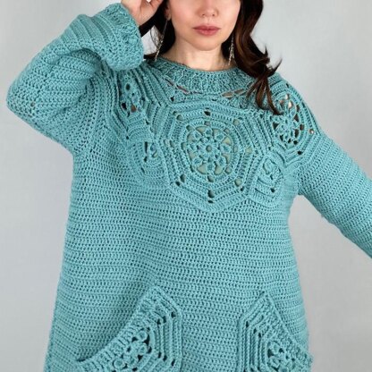 This is a CROCHET PATTERN. The sweater dress looks elegant; it has a distinctive, attractive eye, eye-catching yoke design with complimentary packets; the packets are optional and can be added at the end. Additionally, it has an attractive, charming border pattern to complete the look. The pattern included step-by-step crochet instructions (UK and US terms). The diagrams are marked in different colours – each coloured row- represents a new row - for easy reading. Size from S to 3XL Work crochet yoke (individual pieces connected using slip stitch method technique. Work neck in the round. Work body in the line. Work sleeves in the line. Materials used in this project: Valley Yarns - 100% Extrafine Superwash Merino Wool (50g -89m/97yds) medium weight – group 4. S/M- 1100 g, L/XL-1200 g, 2XL/3XL-1300 g. Additionally, free video tutorials are available.