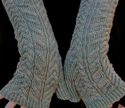 This is a design for a pair of shorter mitts that employs the Alpine method of cabling. It is set apart from the Aran method, primarily because all knitted stitches are knit through the back loop.