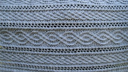 This cable - lace shawl is triangular in shape, and features unique and very ornate Alpine cable panels on one side, which are combined with both lace and knit-purl stitches. The shawl can be worn in many different ways. This shawl will keep you warm on cool spring nights, and you’ll have a lot of fun making it, if you enjoy cabling. The FO is well worth having, as it will be a fun piece to have in your wardrobe, and will attract many “oohs and ahh’s.