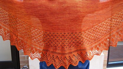 The stitches are both charted and written out line by line. Skill Level: Intermediate (assuming a basic knowledge of lace knitting). The shawl was expertly test knitted by Barbara Robertson, who can be contacted at: Barb. Robertson@ gmail.com. The yarn used in the sample is Handmaiden's Casbah yarn, in colorway, Pumpkin, and requires 3 skeins of that yarn to complete.