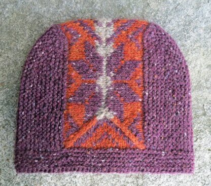 The hat begins with a color work panel knitted in the round, with decrease lines that create a rectangle. Then, stitches are picked up on the long sides and garter stitch short rows are worked to shape the hat. Finally, stitches are picked up and knit down to create the brim.