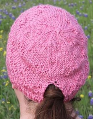 A Hat for a Ponytail Knitted in the round from the bottom up, this pattern has instructions for creating a hole for you to pull your ponytail through. The top of the crown is fitted by using a series of decreases. The designs are formed with Knit and Purled stitches.