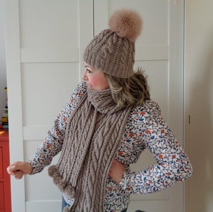 Alpine Scarf knitting pattern create a great texture mixing cables and lace stitch, the lovely pom-poms finishing give a cozy look to this timeless design. Big and super warm, great for going to sky, mountains or just to wrap yourself on a cold winter day, enjoy!