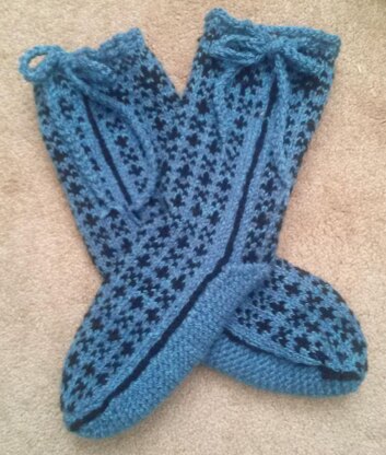 Everyone at Frugal Haus has a pair of these! These are our favorite winter warmers for our feet! Nifty design not only adds color, but stability to the leg part. Fairly easy pattern to knit. If you have knitted much at all, you should be able to make these. The best part is, if the soles get warn out, you can knit new ones and replace them without re-knitting the whole slipper! Everyone will want these! Once they try them on , they will not part with them! Uses worsted weight yarns, knitting needles, 11 circular , US # 6, and # 8, or use double pointed needles. Includes childrens and mens sizes.