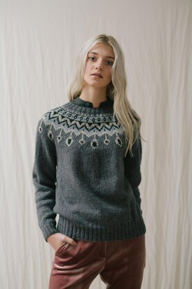 Worked bottom up in the round. Stranded colourwork yoke with short row shaping to form front neck drop. DK yarn worked on 3.75mm needles to give slightly tighter fabric.