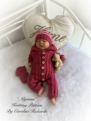 A knitting pattern for a hooded romper suit. This pattern is knitted from the top down on straight needles. Easy to follow line by line instructions