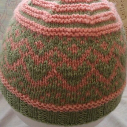 Beginning with a garter striped crown shaping flowing to a stranded colour work design on the body of the hat and finishing with a garter rib band.