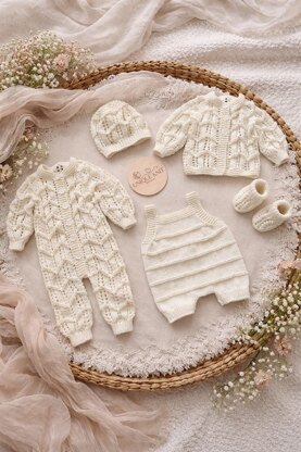 Multipiece design, Romper, Cardigan, Dungarees, Hat and Booties