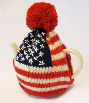 This is the knitting pattern for an american flag tea cosy. Worked in Aran weight (worsted) yarn it has embroidered stars.