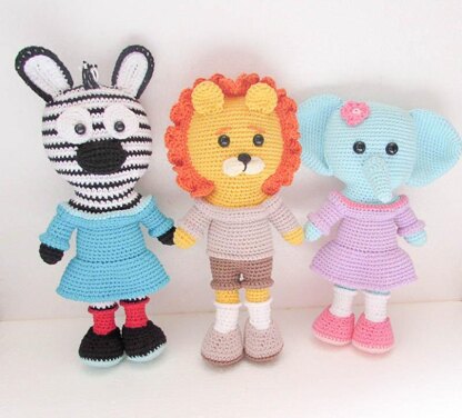 This pattern is for three animals Lion Zebra Elephant They measure around 9 inches/22cm any child or baby would love to play with them, for a small baby you could add a rattle to the body when stuffing. Add a squeaker to the body and they would make a great dog toy, I know my Springer Spaniel puppy approves of them as she stole one and refused to give it back it’s now become her favourite toy.