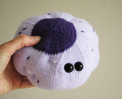What you will need: 2 knitting needles (US3/3.25mm or as per tension advice), 30g double knit light purple yarn (e.g. Sirdar Snuggly DK 219 ‘Lilac’), 5-10g double knit dark purple yarn (e.g. Sirdar Snuggly DK 197 ‘Purple’), 5g double knit white yarn (e.g. Sirdar Snuggly DK 251 ‘White’), 2 black toy safety eyes (15mm wide), Polyfil toy stuffing,1 tapestry needle for finishing