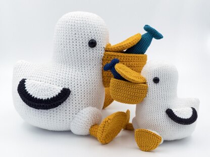 If the recommended yarn thickness and hook size are used the finished large pelican will be 25 cm (9.8 inches) tall by 20 cm (7.8 inches) wide and the small pelican will be 16 cm (6.2 inches) tall by 13 cm (5.1 inches) wide.