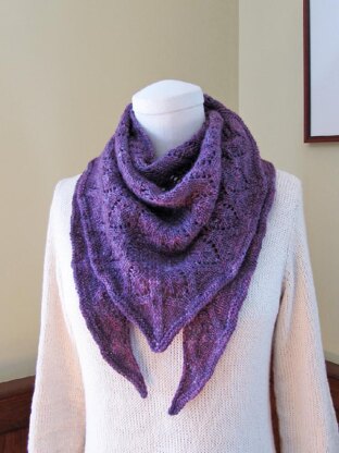 This shawl is worked from the bottom up, and is shaped by decreases along both outer edges and center. The rapid decreases along the outer edges cause the top edge of the finished garment to form a natural curve, and also create more tapered ends than in a typical triangular shawl; these features allow the shawl to drape more easily around the neck and shoulders. Decreases within the border give the lower edge a slight ripple.