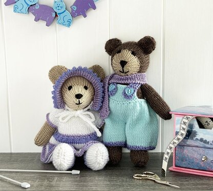 Amy and Oscar teddy bears, cute 21.5cm (8.5 inch) teddy bears knitting pattern complete with the instructions for their clothes. This is a 13 page pattern with clear instructions and lots of photos. The patterns are knit flat and seamed and are very easy to follow.
