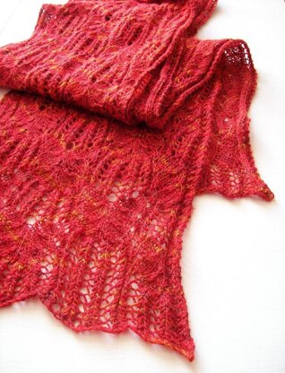 The pattern gives a recipe for achieving the length and width of scarf you want in your chosen yarn. The stitch pattern, borders, and ends are charted, and involve increases and decreases on every row (double-sided lace).