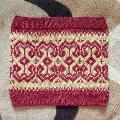 It’s a stranded knitting cowl with ribbing at the top & bottom edge, worked in the round. The design of this pattern is based on traditional motif of tenun ikat Toraja from South Sulawesi, Indonesia.
