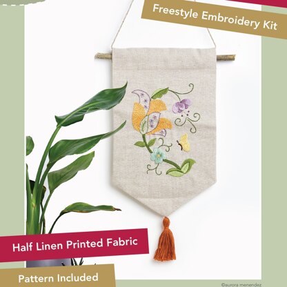 A beautiful folk style freestyle embroidery kit designed by Aurora Menendez. This kit contains all you need to stitch the wall hanging, including Anchor Stranded Cotton threads, a needle, and pre-printed linen blend fabric, as well as detailled charts and instructions. The wooden hanging rod is not included. This Anchor Essentials kit is aimed at intermediate - experienced crafters and is perfect for any nature enthusiast. Anchor Stranded Cotton Threads, linen blend fabric - with pre-printed outline, back fabric, needle, full chart & instructions